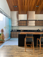 Construída no condomínio Monte Bello I em Leme, essa casa de 230 m² tem uma cobertura pronunciada, apoiada em uma grande parede central, ela amplia a área social, composta pelas sala de jantar e estar/tv, além da ampla cozinha gourmet.